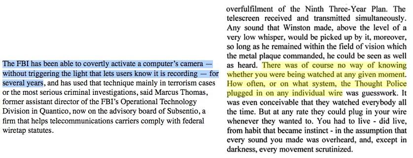 The above logo is what the US NRO (US National Reconnaissance Office) used for its latest spy satellite - The latest spy satellite was sent into orbit this past Thursday by the NRO and it can be recognized by its seal: an evil-looking octopus with furrowed brows that also happens to be wrapping its tentacles around all corners of the Earth.If this is not a slap in our collective face then I don't know what is. Unless we rise against the Machine that is determined to snuff out whatever little rights we still have left, we're fucked. Here's another NRO emblem that will give you more to think about as the NSA/NRO go about playing God....Check out this side by side comparison of a passage from George Orwell's “1984″ to the news report from a former senior FBI official that the FBI can turn on the laptop cameras of individuals without activating the red light that shows the camera is operating. What a madhouse....